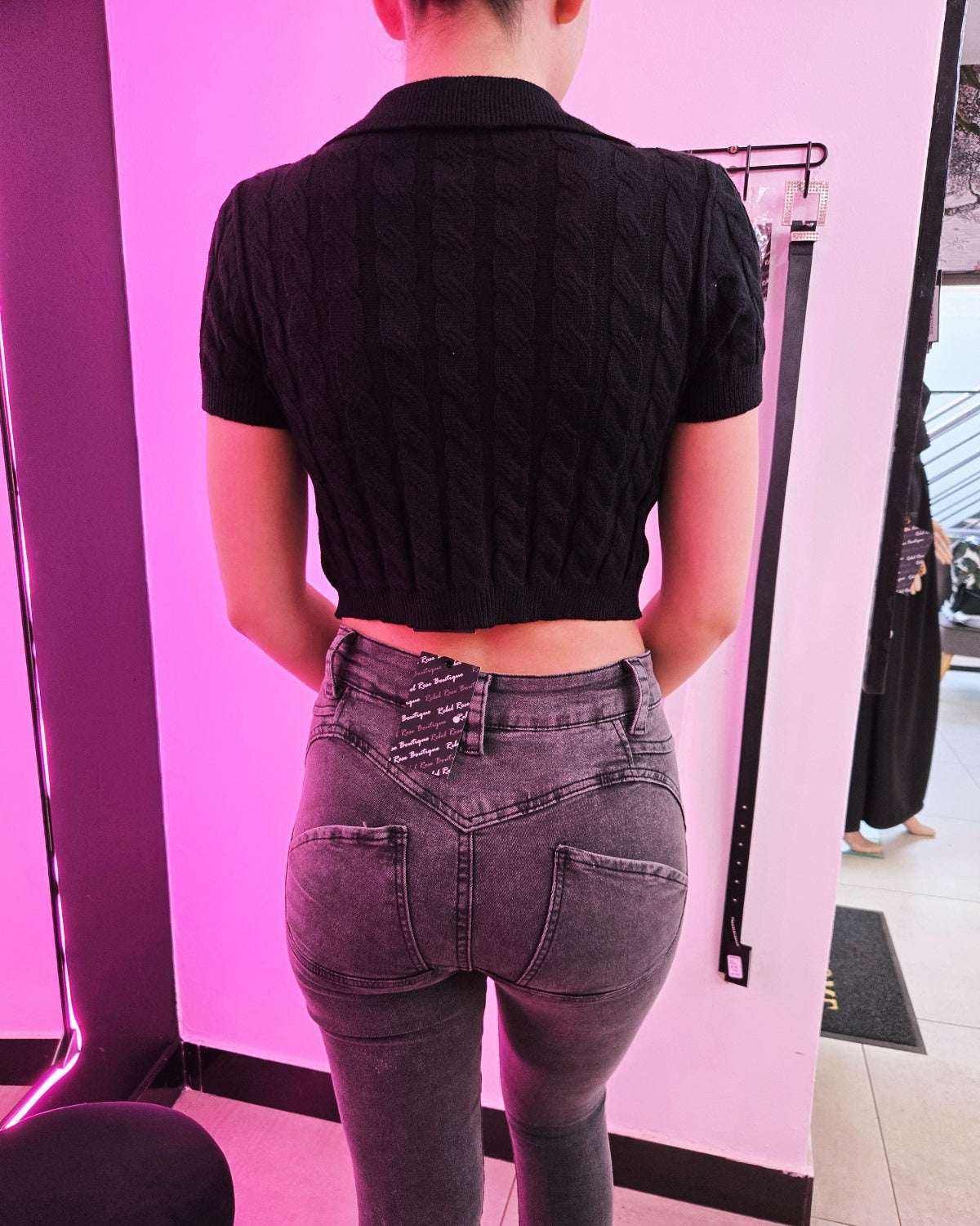 Black cable style knit collar crop top.