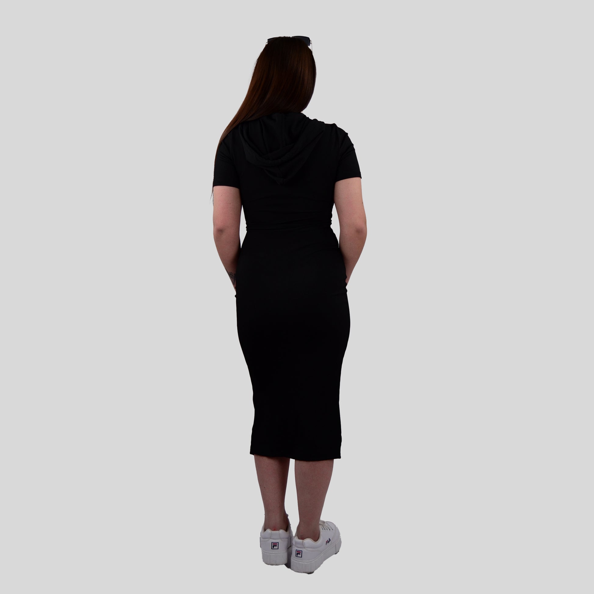 Black ribbed t-shirt style midi dress with hood, ruched and slit detailing.