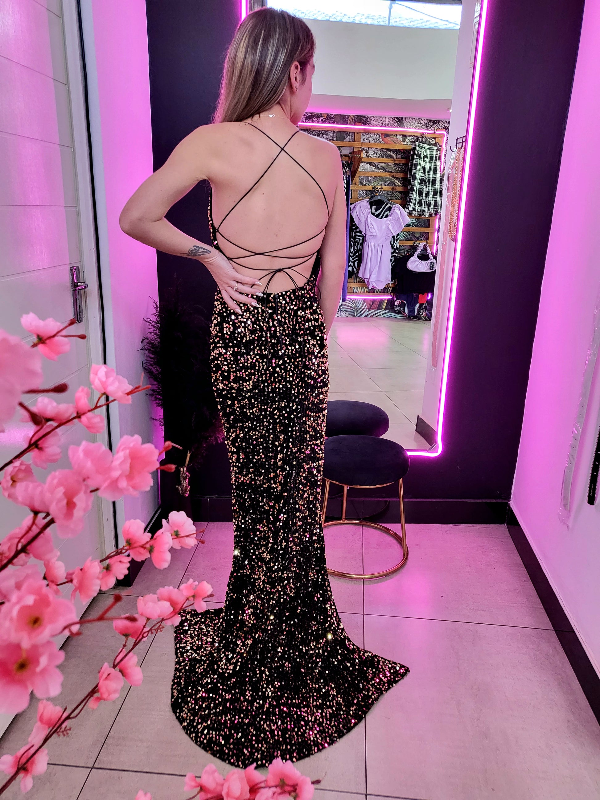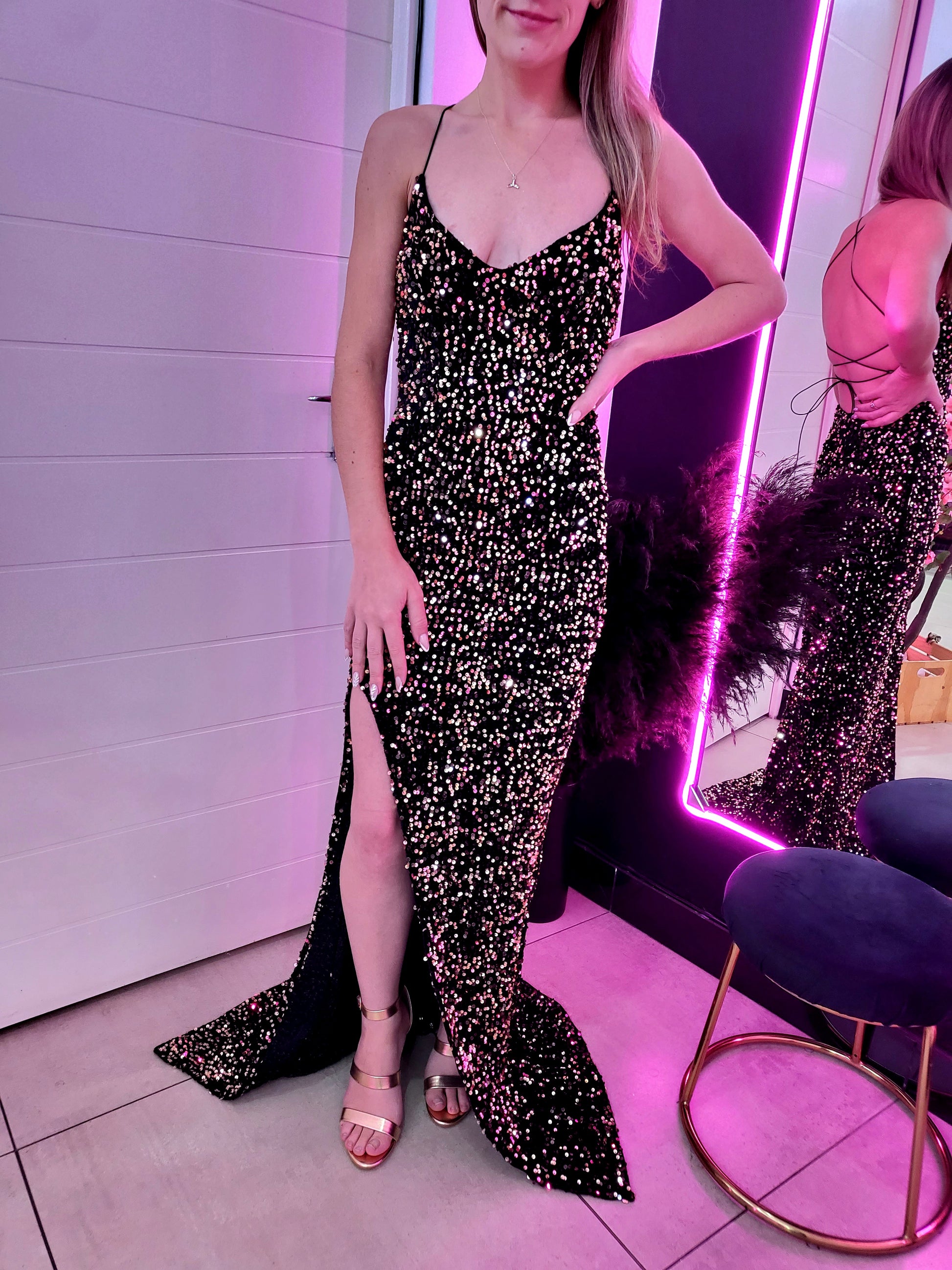 Black & Rose gold sequin velvet evening dress with small puddle train.