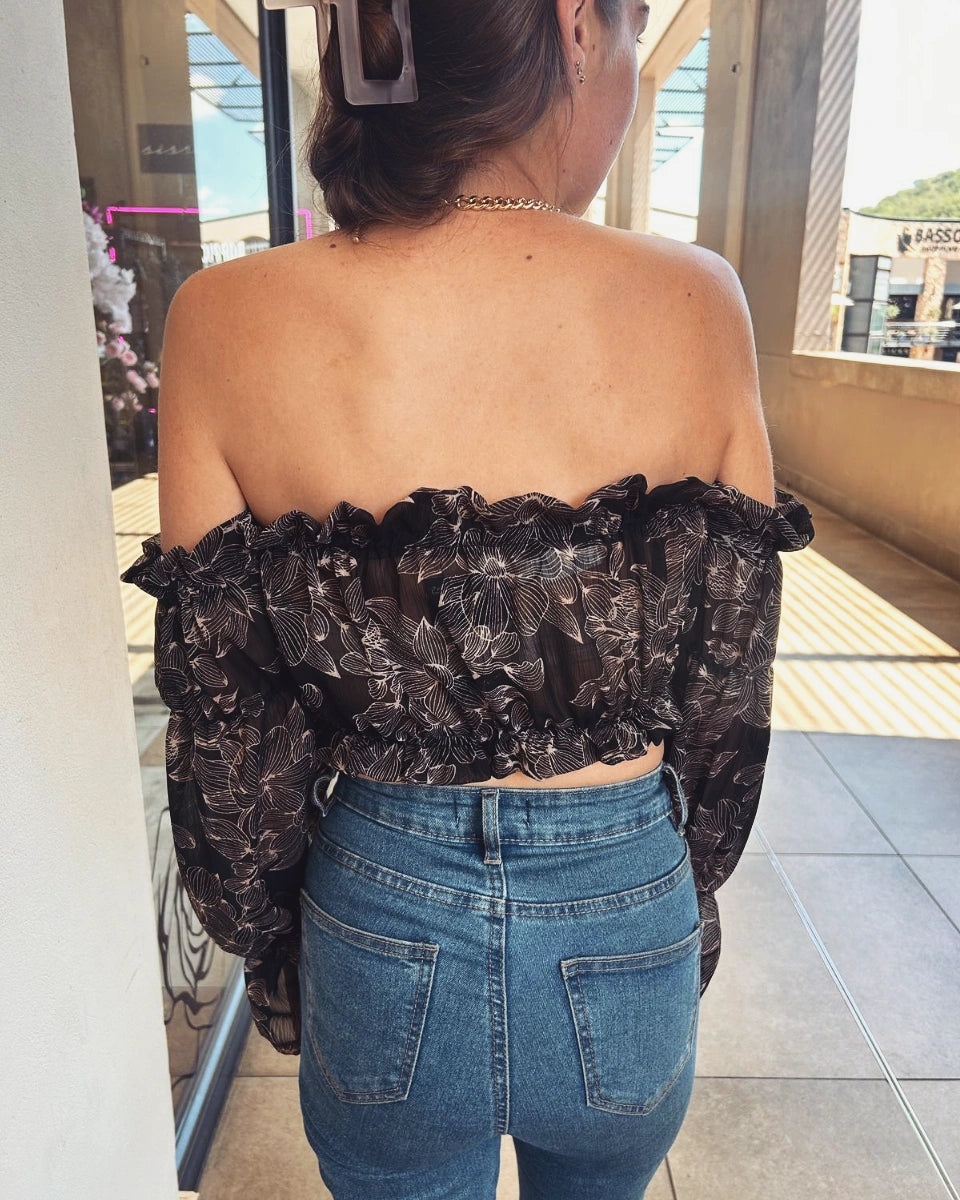 Black sheer floral print crop top with elasticated sleeves attached under the arm.