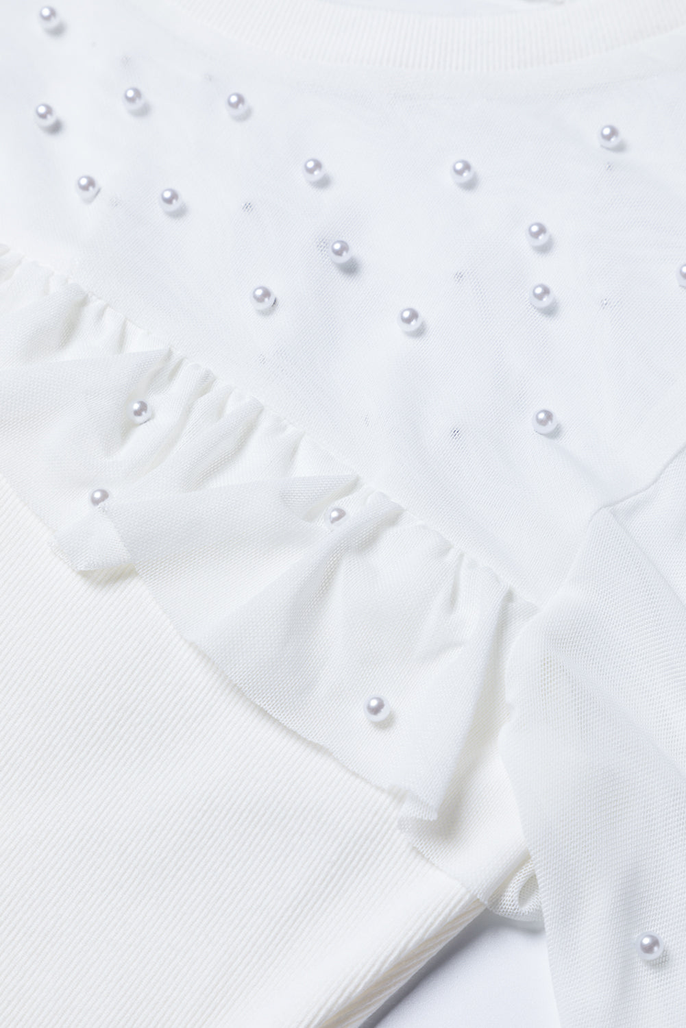 - White pearl mesh long sleeve top with ruffle detail.